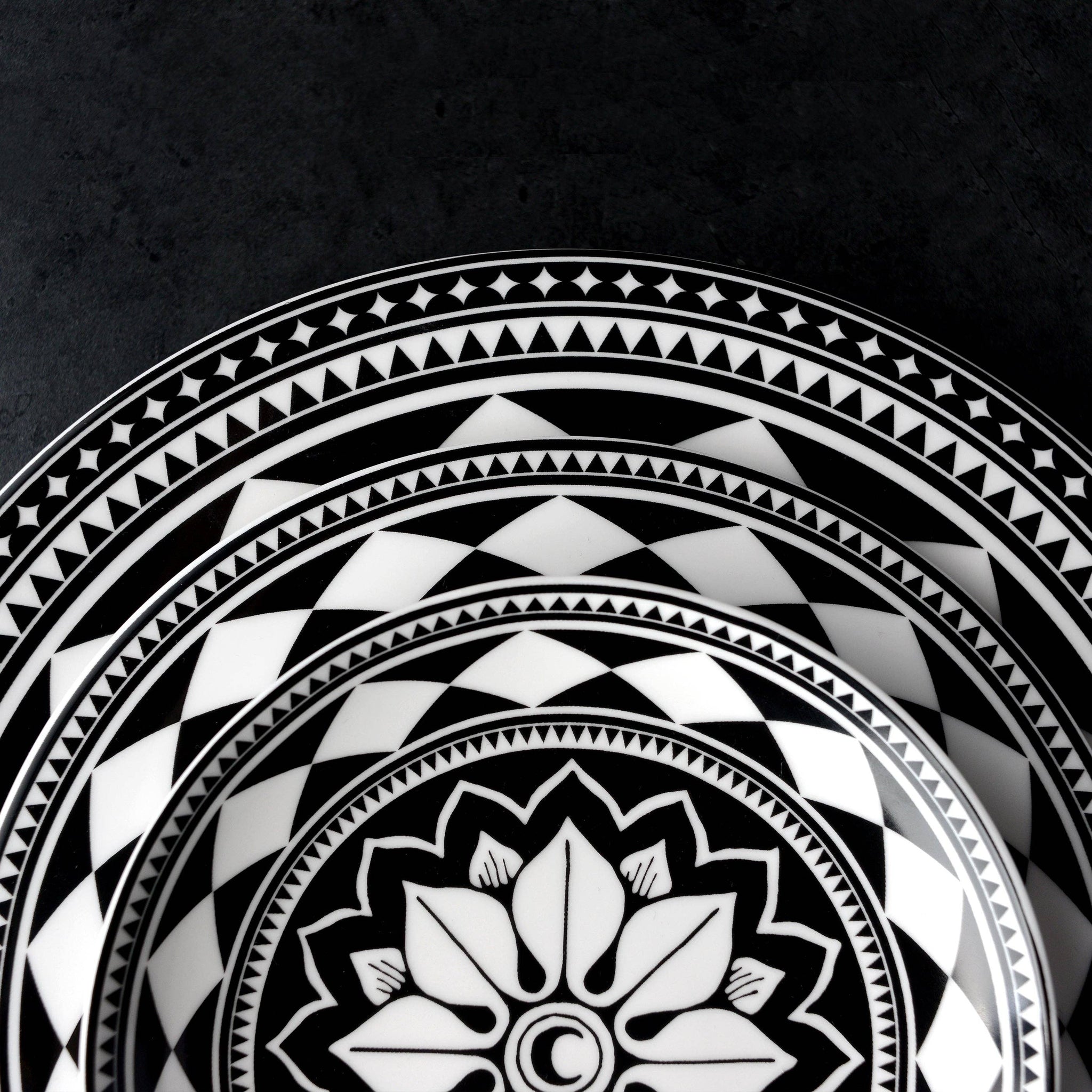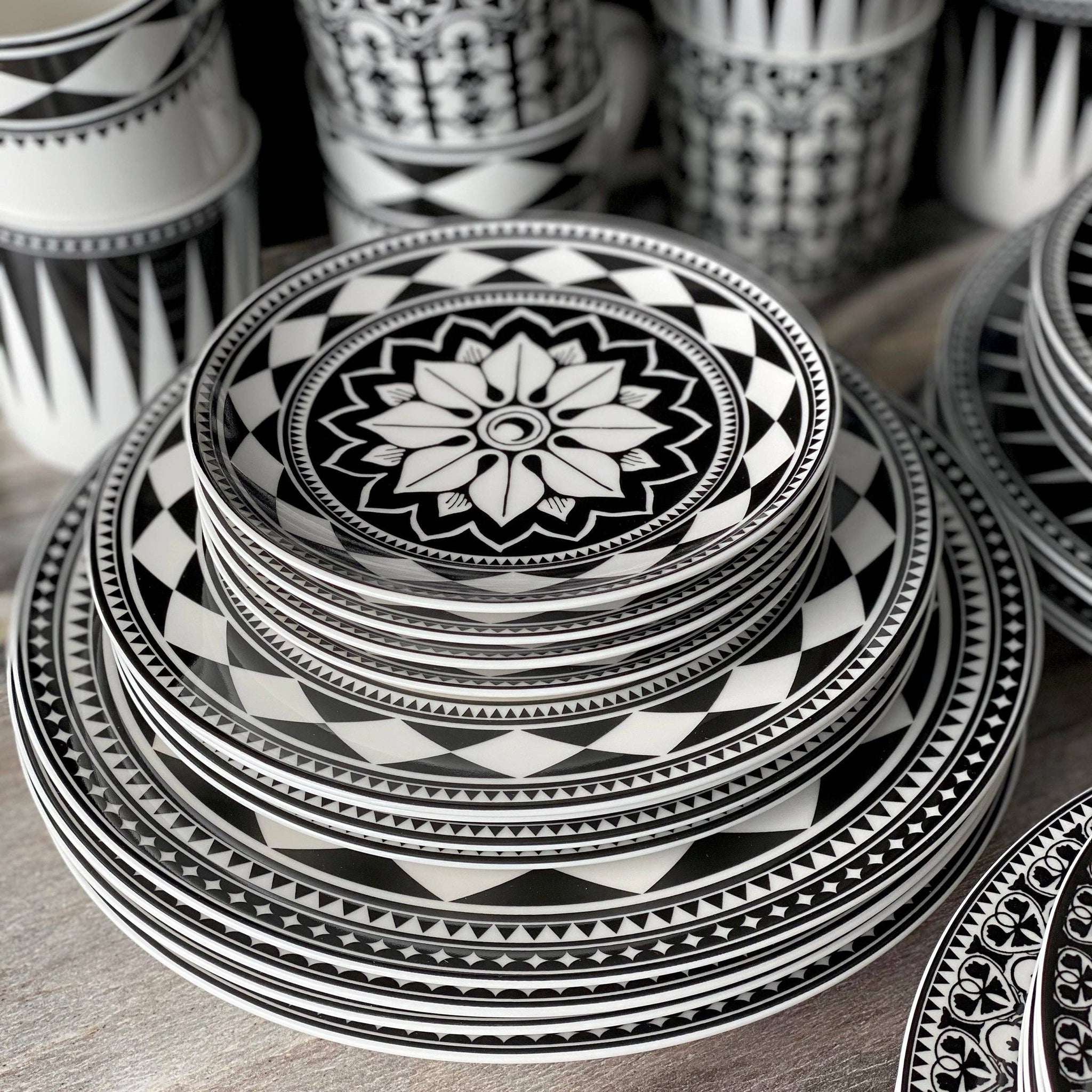 Fez marries bold geometrics with delicate detail, drawing inspiration from the patterns found throughout the markets and casbahs of Morocco. One part architectural and one part woven textile gives this dinner plate its complexity of pattern. Timeless and classic, in crisp black and white, it brings a sophisticated global feel to the table. *